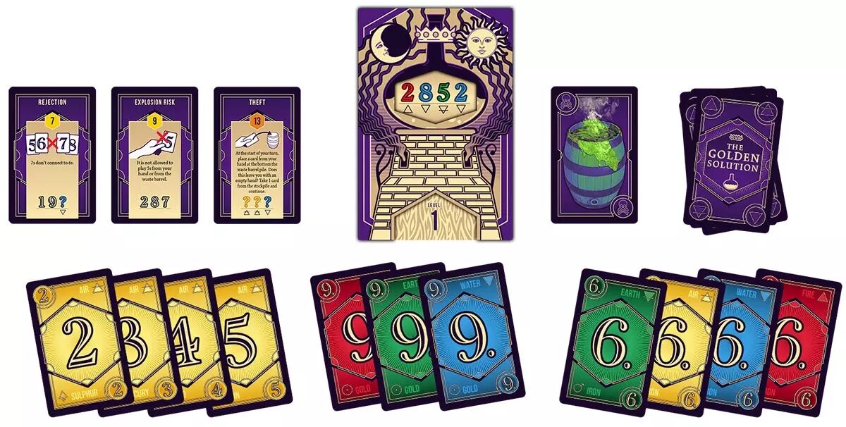 72 cartes "ingrédient", 17 cartes "formule", 20 cartes "événement", 1 carte baril à déchets, 4 étuis pour les formules et un livret de règles