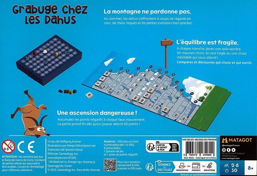 Grabuge chez les Dahus combine calcul, prise de risque et anticipation. Avec des règles accessibles et une interaction constante entre les joueurs, c'est un jeu de tuiles malin où chaque mauvaise estimation pourrait bien provoquer votre chute !