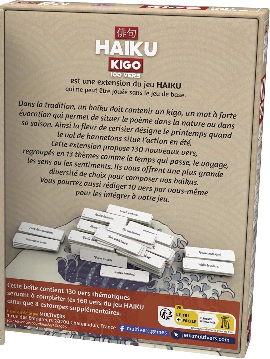 Cette extension propose 100 nouveaux vers, regroupés en 13 thèmes comme le temps qui passe, le voyage, les sens ou les sentiments. Ils vous offrent une plus grande diversité de choix pour composer vos haïkus. Vous pourrez aussi rédiger 10 vers par vous-même pour les intégrer à votre jeu.
