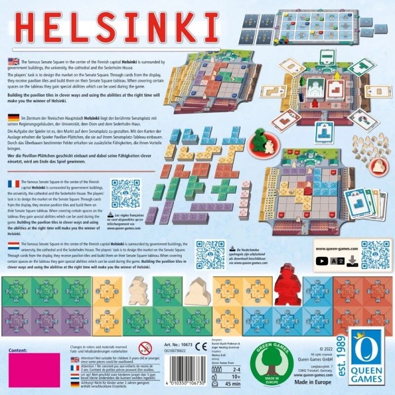 Helsinki propose une expérience stratégique qui ravira les amateurs de puzzles tactiques. Planification, optimisation et gestion minutieuse seront les clés pour transformer la place la plus célèbre d’Helsinki en un chef-d’œuvre afin de rafler le titre de meilleur architecte !