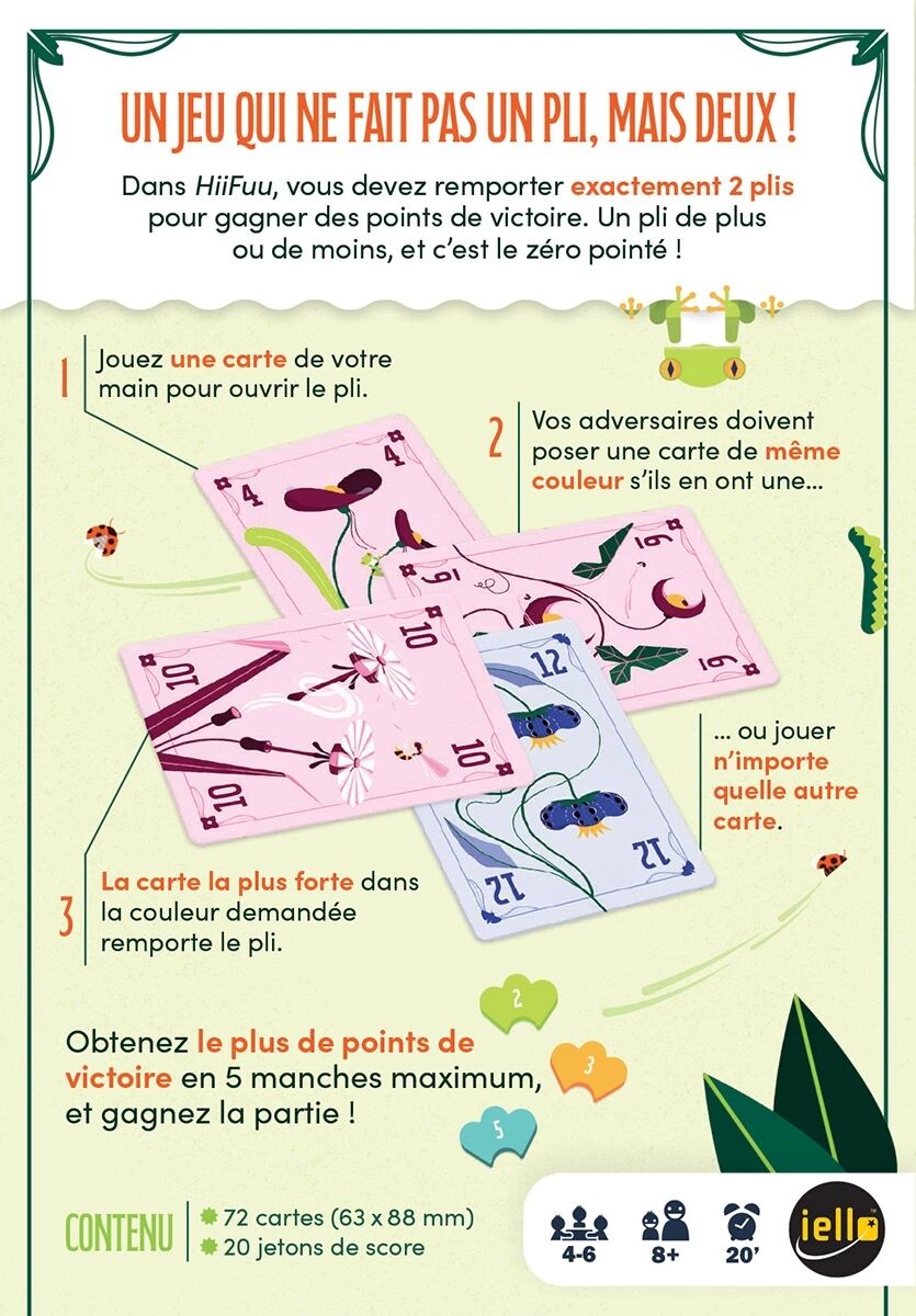 Accessible dès 8 ans, Hii Fuu est parfait en famille ou entre amis. Rapide à expliquer, rapide à jouer, il revisite brillamment le jeu de plis traditionnel avec une mécanique moderne et addictive.