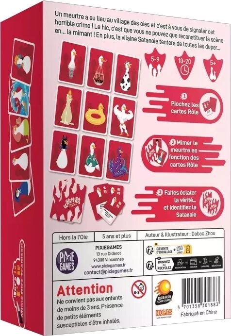 Un meurtre a eu lieu au village des oies et c’est à vous de signaler cet horrible crime ! Le hic, c’est que vous ne pouvez que reconstituer la scène en… la mimant ! En plus, la vilaine Satanoie tentera de toutes vous duper…