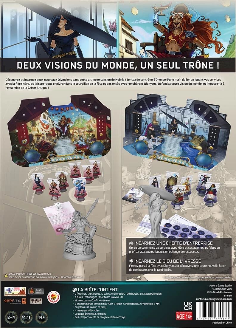 2 figurines, 12 standees, 12 tuiles Amélioration, 1 Dé d’Excès, 1 plateaux Olympien, 18 tuiles Technologies MK, 2 tuiles Pouvoir MK, 18 mini cartes conflit 44x68 mm, 39 cartes projets 63x88 mm, 4 extensions de taverne (1 Anéla, 2 Réghe, 1 Anthestéries, 2 Promotion, 2 MK), 1 règle (fr, en), 20 Leu, 4 marqueurs Olympien, 30 jetons en carton, 1 sac en tissu, ses compartiments de rangement Game Trayz
