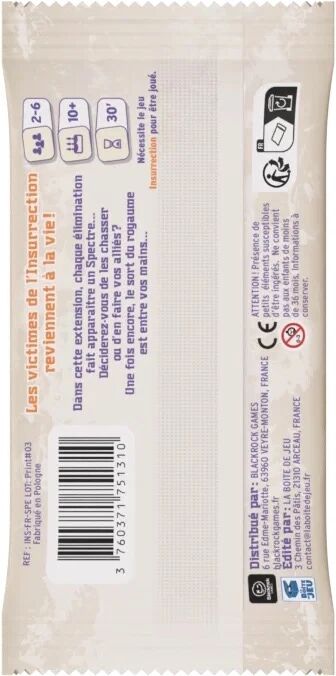 Enfin, avec de nouveaux personnages et un lieu inédit, l'extension Spectres renouvelle les sensations sans complexifier les règles. Elle accentue ce qui fait la force de Insurrection : des parties rapides, tendues, pleines d’interactions directes et de coups opportunistes.
