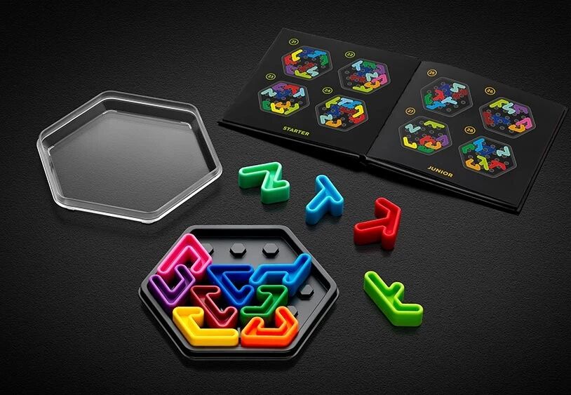 1 plateau hexagonal avec couvercle, 12 pièces « soft touch », 1 livret comportant 120 défis et leurs solutions, 1 livret de règles
