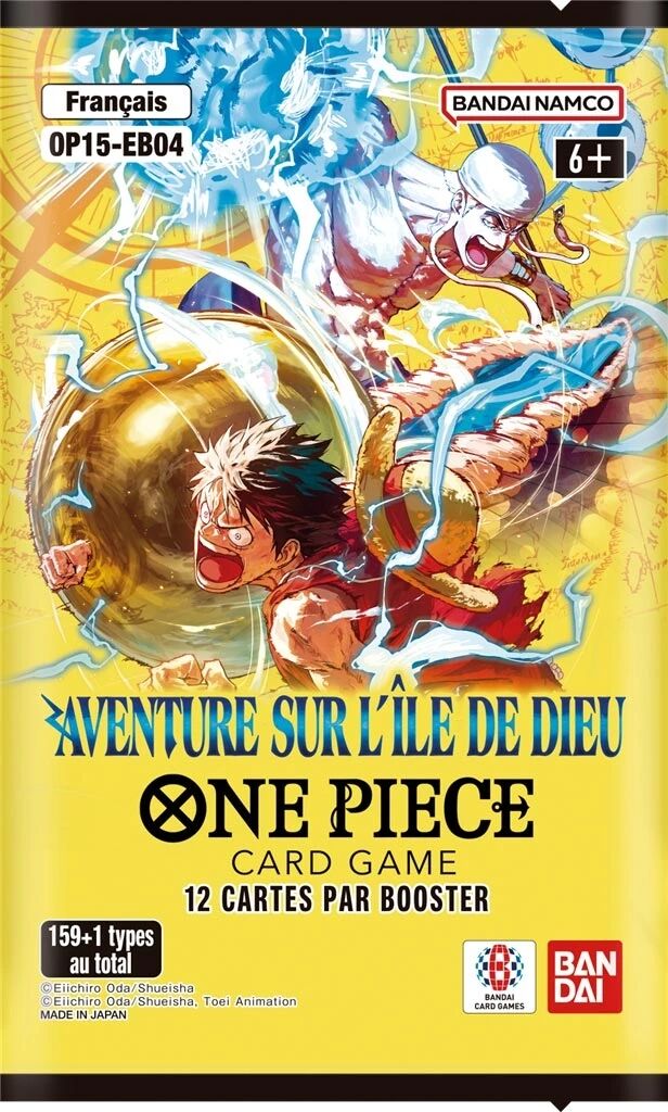 Le Booster OP15 Aventure sur l'Île de Dieu pour le jeu de cartes One Piece contient des 12 aléatoires cartes pour compléter vos decks.