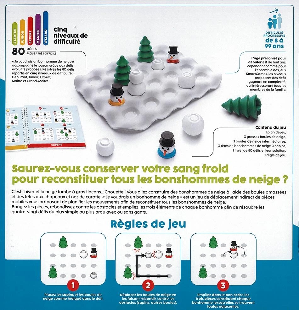 Vous allez construire des bonshommes de neige à l’aide des boules amassées et des têtes aux chapeaux et nez de carotte. « Je voudrais un bonhomme de neige » est un jeu de déplacement indirect de pièces mobiles vous proposant de planifier les mouvements afin de reconstituer tous les bonshommes de neige.