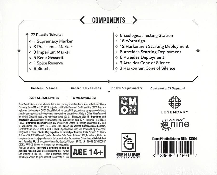 L'ensemble de 77 jetons en plastique est un pack exclusif pour Dune : La Guerre pour Arrakis Ce jeu vous propose des versions plastiques robustes des jetons nécessaires, issus de la boîte de base. Soit un total de 77 jetons plastiques, gravés et en couleur !