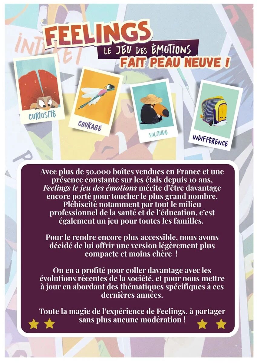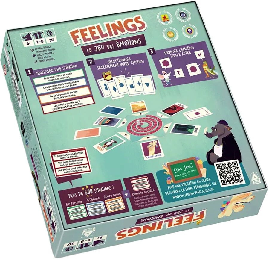Dans le jeu Feelings, il s'agit à la fois de partager son ressenti par rapport à une situation proposée mais aussi de deviner celle de son partenaire de jeu.