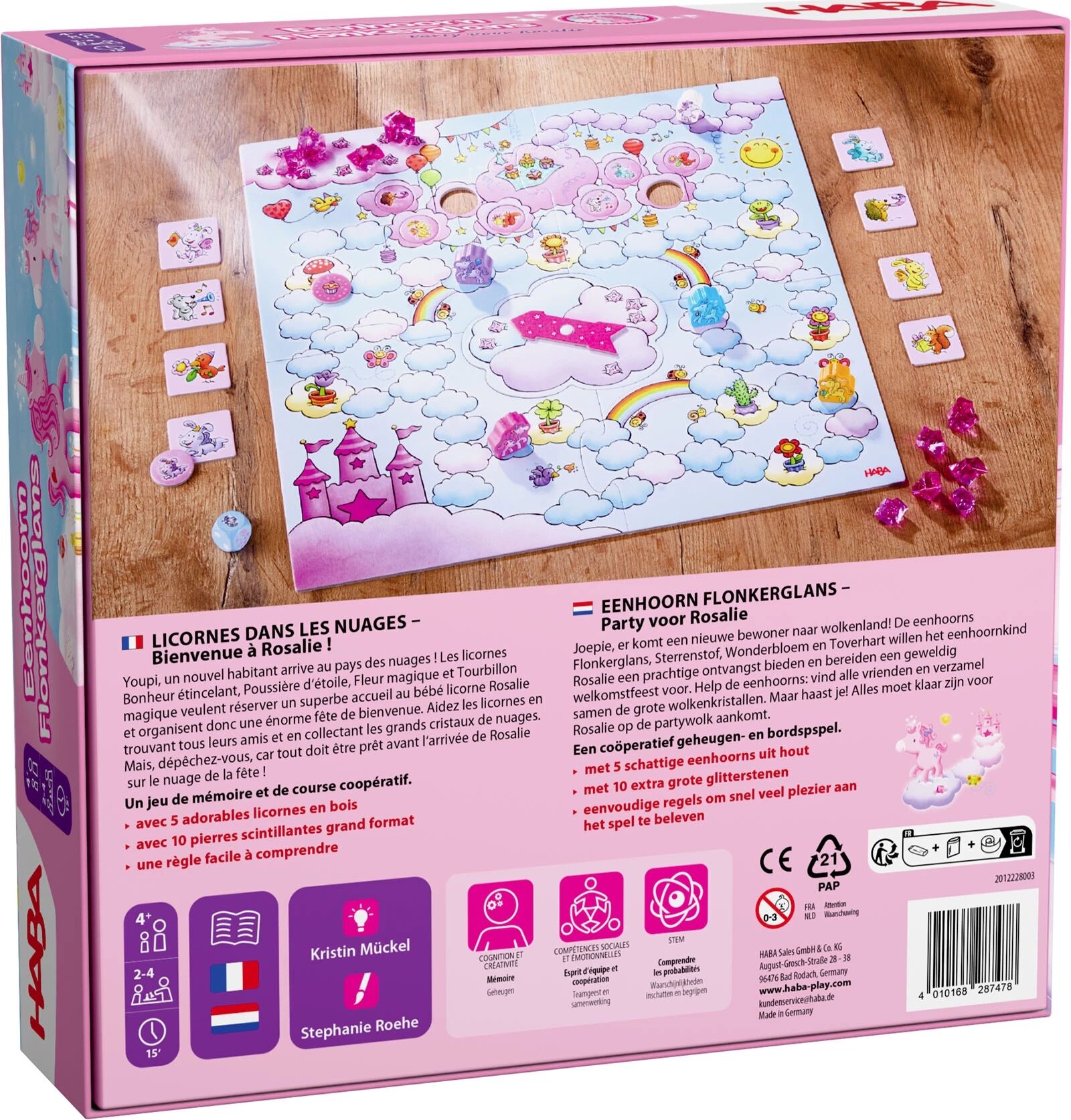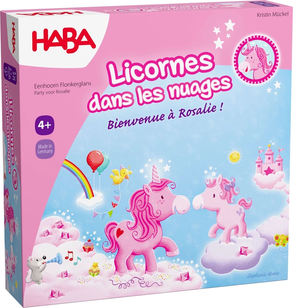 4 licornes : Bonheur étincelant (rose), Poussière d'étoile (jaune), Fleur magique (violet) et Tourbillon magique (turquoise), 1 bébé licorne Rosalie (rose), 1 dé, 1 plateau de jeu avec une flèche tournante, 8 tuiles d'amis rondes, 8 tuiles d'amis carrées, 10 cristaux de nuages, 1 règle du jeu.
