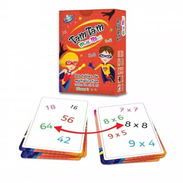 Le joueur doit retrouver l’unique paire qui existe entre deux cartes: une carte-nombres et une carte opérations. TAM TAM Multimax Niveau 2 renforce la mémorisation des tables de multiplication de X2 à X9. Chaque table est représentée sur une carte de couleur qui facilite la mémorisation.