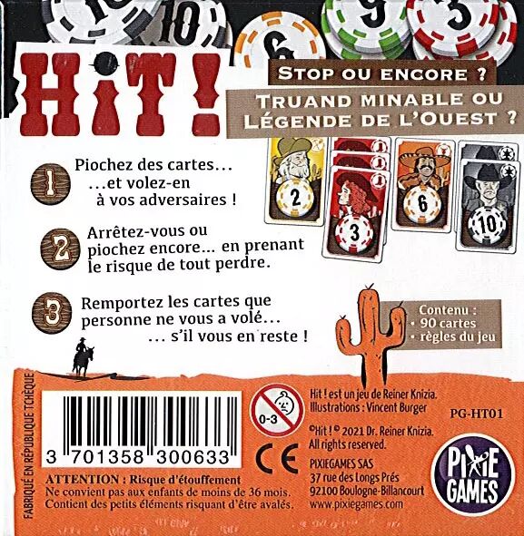 Hit ! est un jeu de Stop ou Encore dans lequel vous devez piocher des cartes pour obtenir des points de victoire.