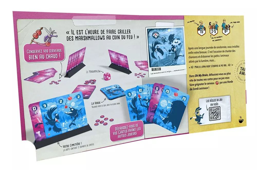 Oh My Brain est un jeu de défausse dans lequel vous tenterez de vous débarrasser de vos cartes, représentant les Zombanimaux, plus rapidement que vos adversaires. Alors que vous étiez en train de griller des Marshmallows au coin du feu, les Zombanimaux eux, tenteront de vous grignoter le Marsh…..cerveaux ! Vous devrez vous débarrasser des cartes de votre main mais aussi, plus compliqué, de celles de votre cimetière.