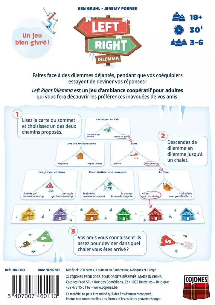 Saurez-vous deviner les préférences inavouées ou inavouables de vos amis ? Entre 2 propositions, quelle sera la bonne ? Et dans cette descente pleine de rebondissement, où vous mènera vos choix, dans quel chalets ? C'est tout le défi délirant que vous propose ce jeu d'ambiance pour adultes.