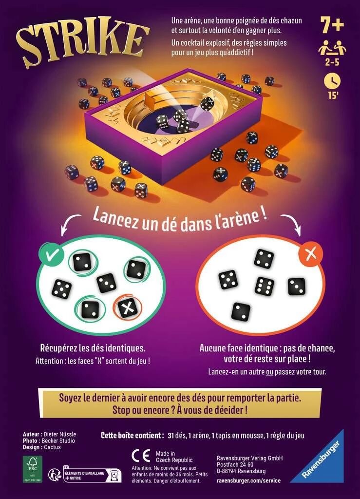 Dans le jeu de dés Strike, vous devez lancer un dé dans l'arène, récupérer les dés identiques ou les laisser s'il n'y a pas au moins un double ! Soyez le dernier à avoir encore des dés pour remporter la partie. Alors Stop ou Encore ? Décidez-vous mais gare au danger de tout perdre !