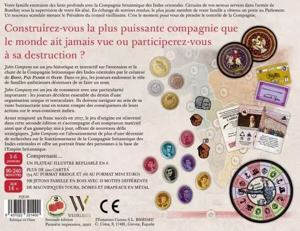 John Company vous plonge au au coeur de la mécanique de la colonisation économique des XVIIIème et XIXème siècle. Avec cette compagnie, monopole d'état britannique, le Royaume-Uni s'est construit un empire tout autour du monde et sur lequel "le soleil ne se couche pas". Le jeu aborde de nombreux thèmes clés de l'impérialisme et de la mondialisation et leurs conséquences. En tant que tel, ce jeu pourrait ne pas convenir à tous les joueurs. Veuillez vous assurer que tous les membres de votre groupe consentent à cette exploration avant de jouer.