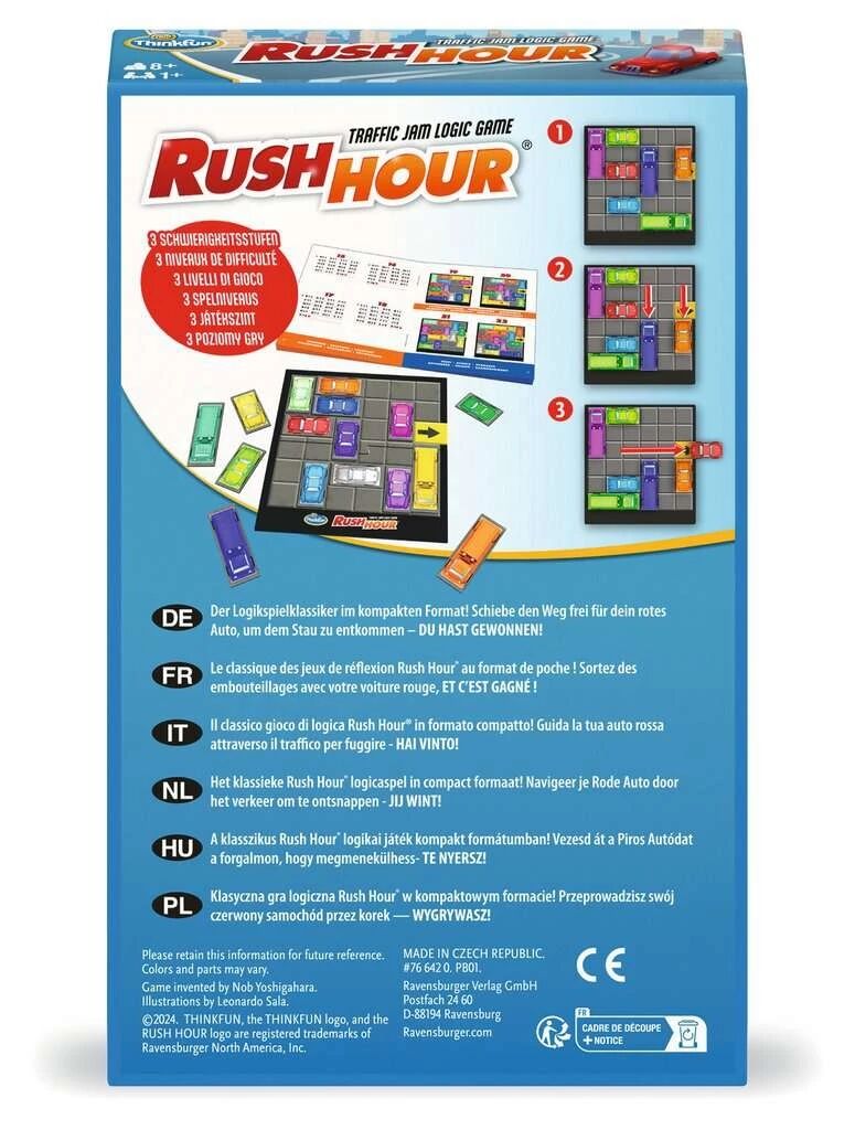 Rush Hour est LE jeu roi des casse-têtes ! Vous en voulez toujours plus et où que vous alliez ? Mini jeu Rush Hour vous suivra partout. Avec son petit format de boîte, relevez les défis ! Glissez-le dans votre sac et jouez où que vous soyez !