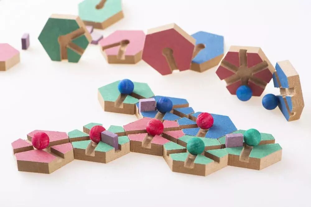 36 tuiles ( 6 par couleur ) - 24 billes (4 par couleur ) - 18 blocs