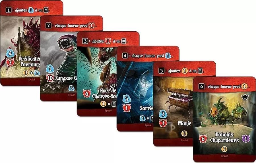 226 cartes, 2 dés, 35 séparateurs, 51 marqueurs, 5 plateaux, 20 pions en bois, 32 jetons en carton et un livret de règles