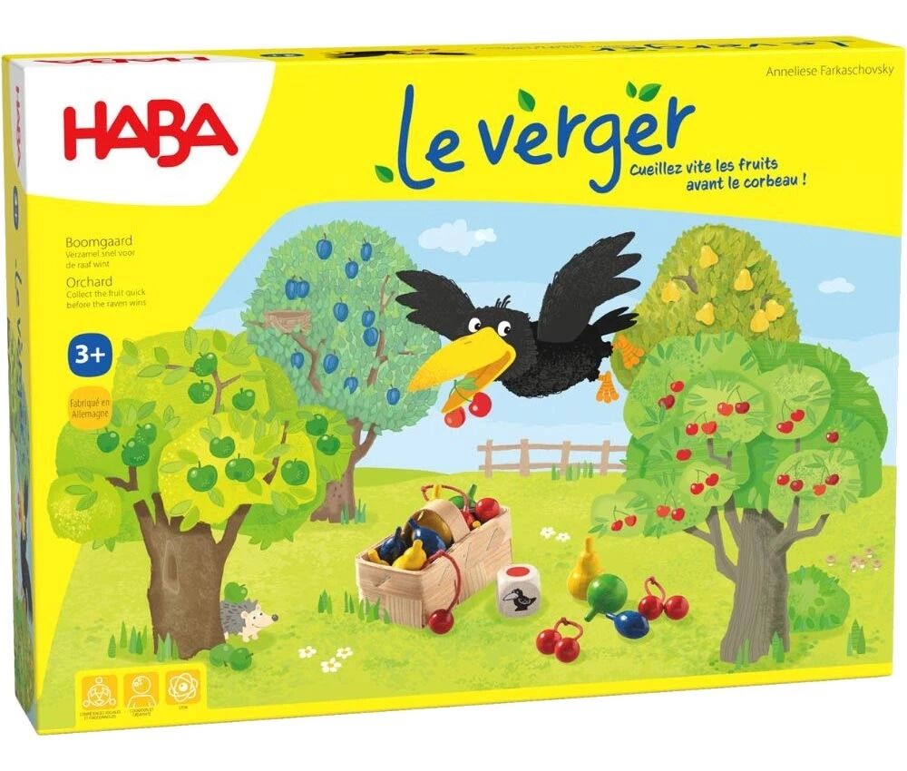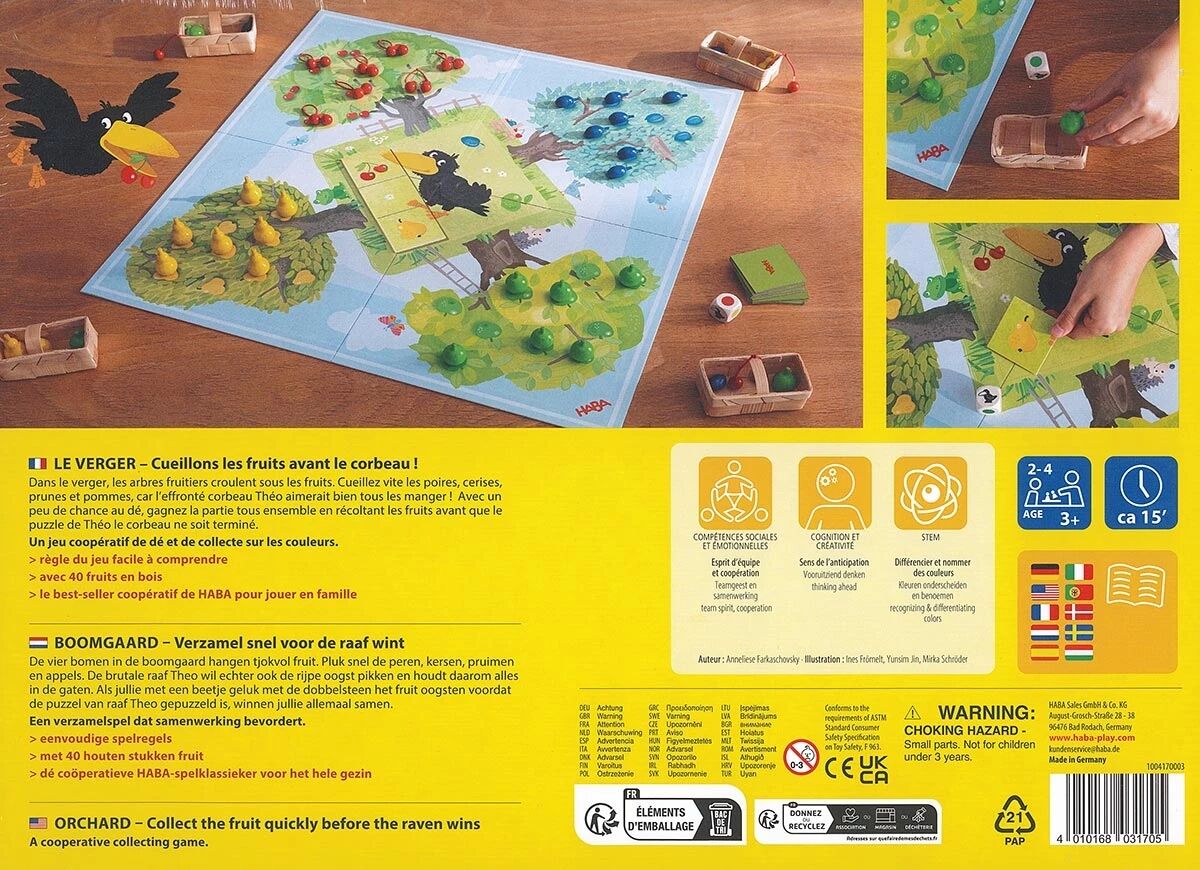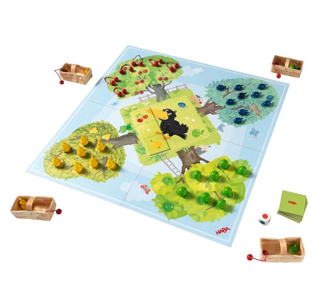 Avec le jeu Le Verger, les enfants apprennent à gagner ou à perdre ensemble. Dans ce jeu coopératif, les enfants doivent cueillir ensemble tous les fruits du verger avant que le puzzle du corbeau ne soit reconstitué.