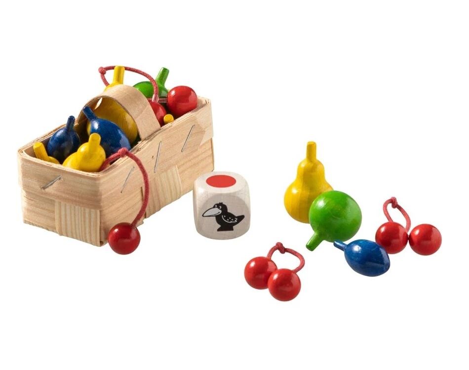 1 plateau de jeu 50 x 50 cm, 40 fruits en bois de hêtre issu de forêts gérées durablement, 4 paniers, 1 corbeau (9 pièces de puzzle), 1 dé et 1 règle du jeu.