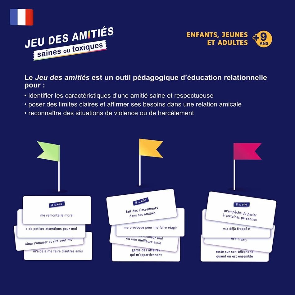 Le jeu des Amitiés Saines ou Toxiques est un jeu efficace et engageant. En 3 minutes, la règle est comprise et les participants plongent dans les enjeux des amitiés. Le Jeu des amitiés est un outil percutant pour aborder des sujets essentiels.