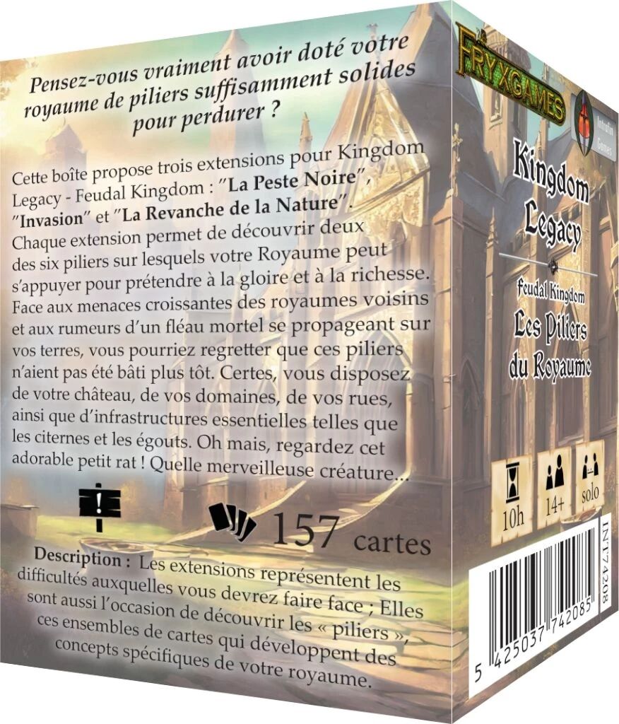 Dans Les Piliers du Royaume, votre mission est de renforcer les bases de votre royaume tout en faisant face à des crises grandissantes : invasions ennemies, catastrophes naturelles et fléaux dévastateurs. Ces scénarios ajoutent une nouvelle dimension stratégique et narrative à vos parties, où chaque décision influence la survie et la gloire de votre royaume.