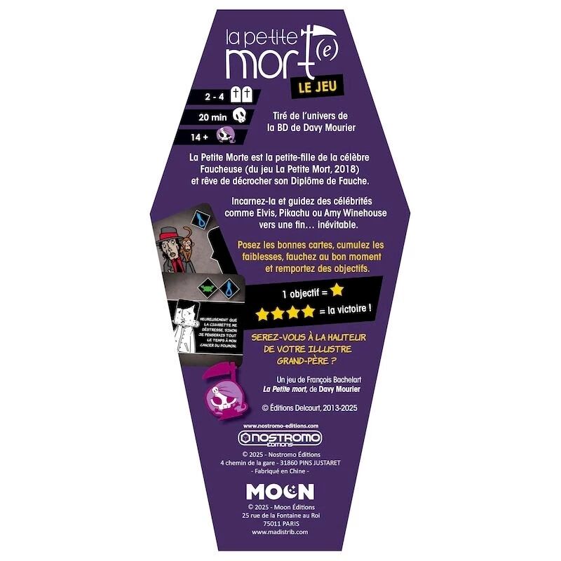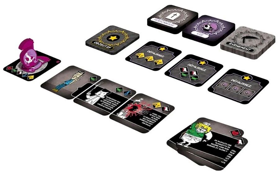 60 cartes Vie, 30 cartes Personnages, 16 cartes Objectif, 15 cartes Evènement, 4 cartes Petite Morte, 4 pions Petite Morte, Livret de règles