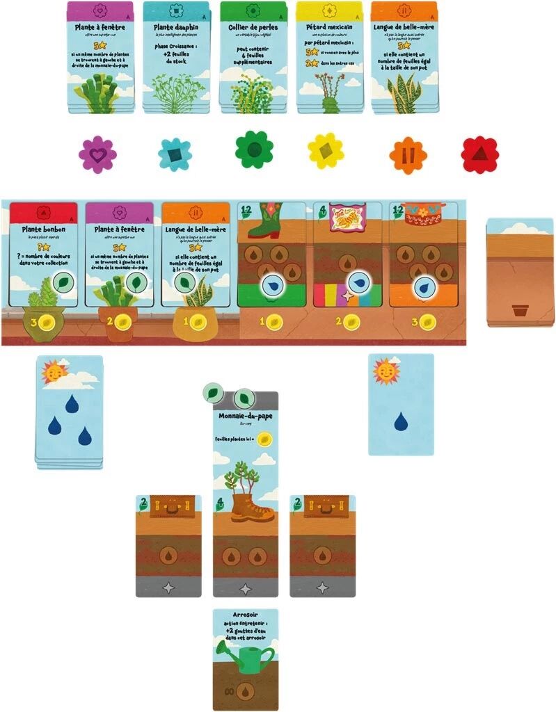 Mais dans Le Jardin d’Eugénie, la concurrence est rude ! Grâce à l’action de coupe, vos adversaires peuvent ralentir votre progression… tout en favorisant la leur. Vous pouvez ainsi prélever une bouture chez un voisin, modifier les équilibres et perturber ses plans. Mais attention : une plante fleurie devient intouchable et rapporte de précieux points. Le positionnement des plantes autour de votre plante centrale est également primordial, certaines espèces marquant des points selon leur emplacement ou la diversité de couleurs présentes dans votre collection.