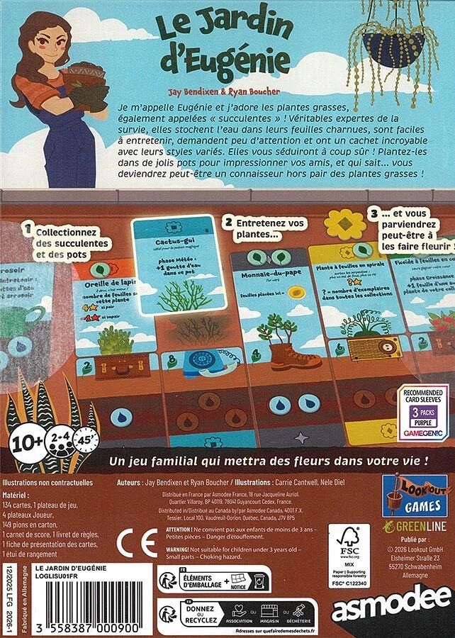 Le Jardin d’Eugénie est un jeu de stratégie pour 2 à 4 joueurs. Dans ce jeu de gestion et d’optimisation, développez votre propre collection de succulentes dans la petite boutique d’Eugénie. Au fil de 12 saisons, achetez plantes et pots, gérez l’arrosage et adaptez-vous aux caprices de la météo pour composer la collection de plantes grasses la plus harmonieuse possible.