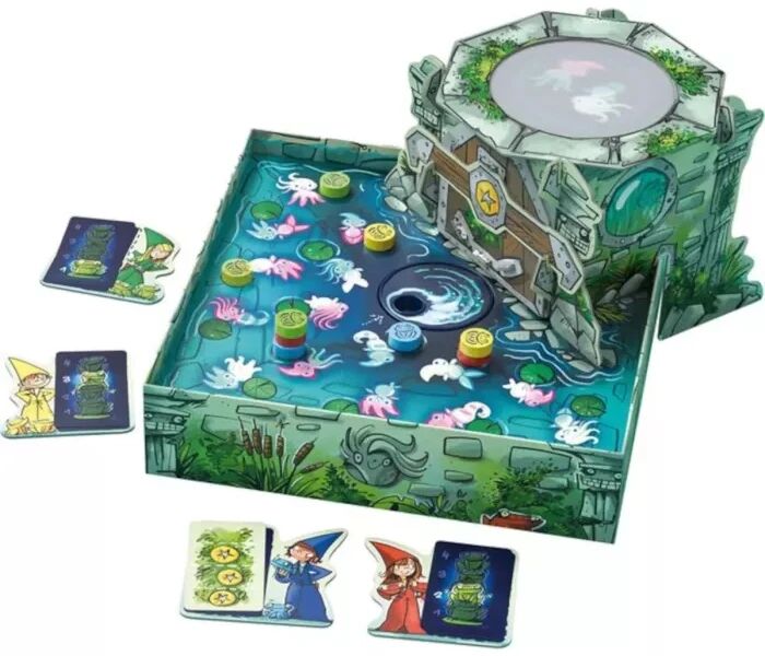 Dans Le Puits Mystérieux, vous explorez un puits en trois dimensions doté d’un ingénieux mécanisme rotatif. Chaque manche commence par l’insertion secrète d’un disque « lutin » dans le puits. Au départ, impossible de distinguer quoi que ce soit ! Mais à mesure que le tourbillon magique tourne, les couleurs puis les silhouettes des lutins apparaissent progressivement. Les joueurs doivent analyser attentivement ce qu’ils perçoivent et déplacer leurs grenouilles sur les nénuphars pour les positionner à côté des bons lutins.
