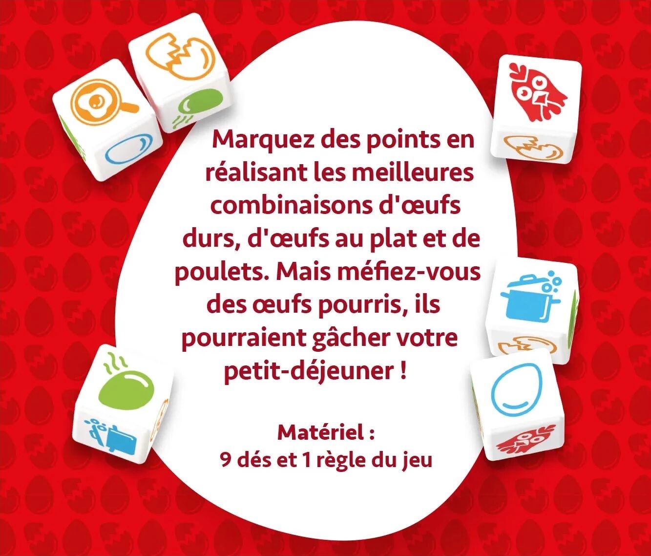 Rapide à expliquer, très interactif et plein de rebondissements, Les Œufs sont Faits est un jeu d’ambiance familial qui repose sur la prise de risque et l’observation. Le premier joueur à atteindre 100 points remporte la partie… à condition que ses œufs tiennent encore la cuisson.