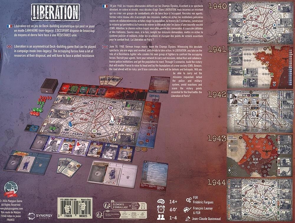 Grâce à son mode solo automatisé pour l’Occupant, Libération est également jouable en solitaire ou en coopération contre le système. Profond, stratégique et chargé d’histoire, Liberation est un jeu de stratégie exigeant qui met en scène un affrontement psychologique permanent où chacun de vos choix conditionnera le destin de Paris !