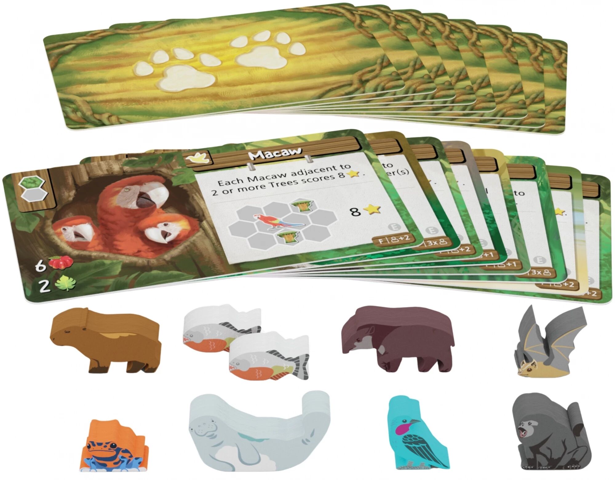 8 animaux uniques avec 8 cartes et 9 animaux en bois (dont 2 piranhas), 8 cartes Animaux : les séries E et F