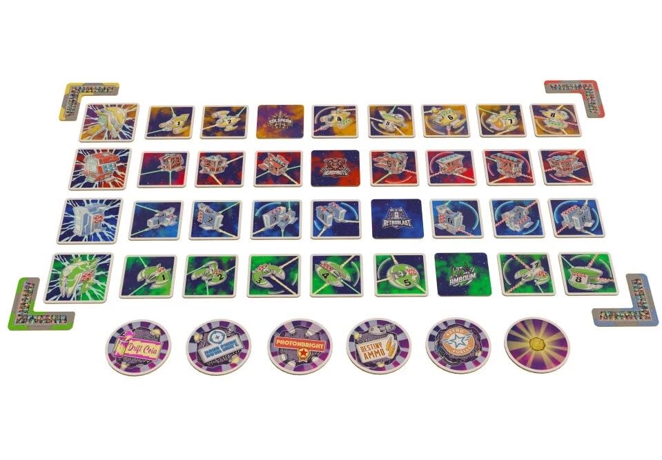 32 tuiles Vaisseau Spatial – 4 tuiles Base de Faction – 6 tuiles Astéroïde Sponsorisé – 4 tuiles Coin de l’Arène – 1 livret de règles.