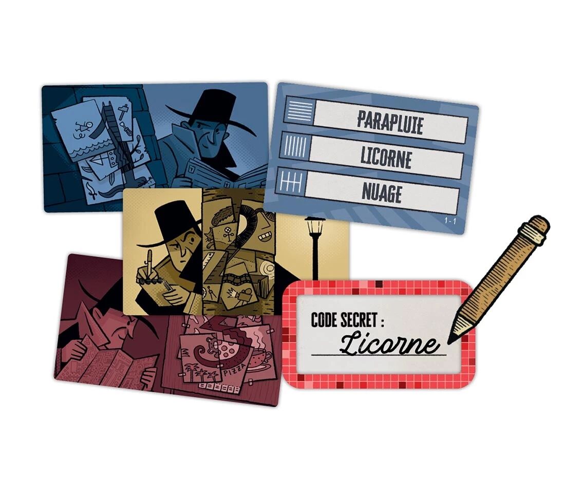 200 cartes Mot (600 mots / 3 niveaux de difficulté), 8 tuiles Agent (recto verso), 8 marqueurs effaçables, 1 sablier de 10 secondes, 8 carnets, 32 jetons Timbre, 1 livret de règles