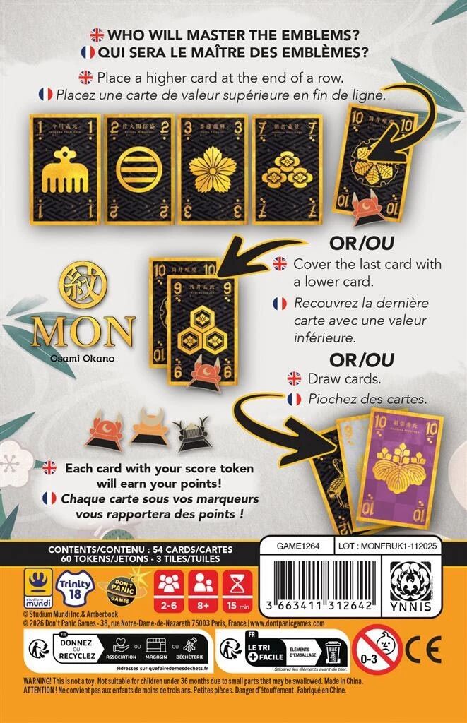 Mon est un jeu de cartes pour 2 à 6 joueurs. Dans ce jeu inspiré des emblèmes du Japon féodal, vous manipulez des cartes numérotées pour prolonger ou modifier des lignes d’emblèmes. Placez votre jeton au moment opportun pour capturer les cartes et marquer le plus de points possible.