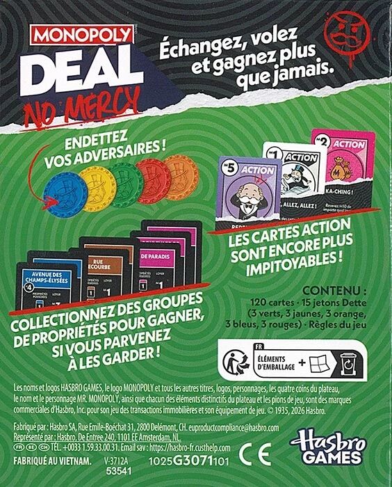 Le jeu Monopoly Deal No Mercy reprend les bases de Monopoly Deal et les propulse dans une version bien plus incisive et sans concession. L’objectif reste simple : constituer des groupes de propriétés pour l’emporter. Mais ici, chaque tour devient une lutte d’influence où tous les coups sont permis.