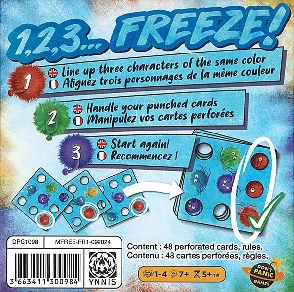 Dans le jeu Monster Freeze, chaque joueur reçoit 3 cartes perforées au début de la partie, une autre est placée au centre de la table, entre les joueurs. Chaque carte comporte 9 cases rondes en une grille de 3 sur 3. Sur quatre de celles-ci, un petit monstre de couleur apparait, les autres sont évidées.