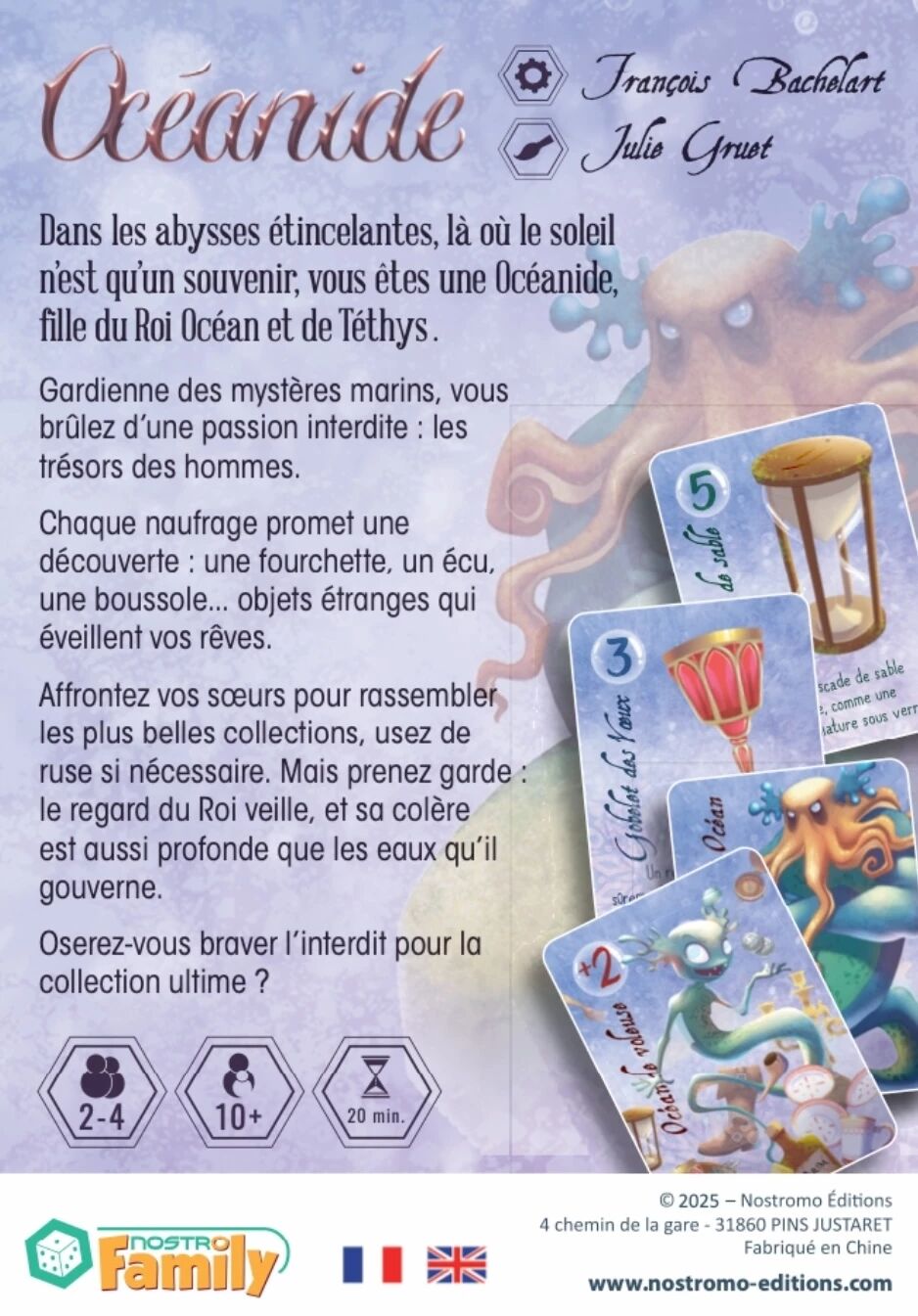 La partie d’Océanide se termine lorsque la pioche est épuisée, puis vient le calcul des points : séries complètes, objets restants en vitrine, cartes en main et Océanides Voleuses accumulées composent votre score final. Le joueur qui a le plus de points remporte la partie.