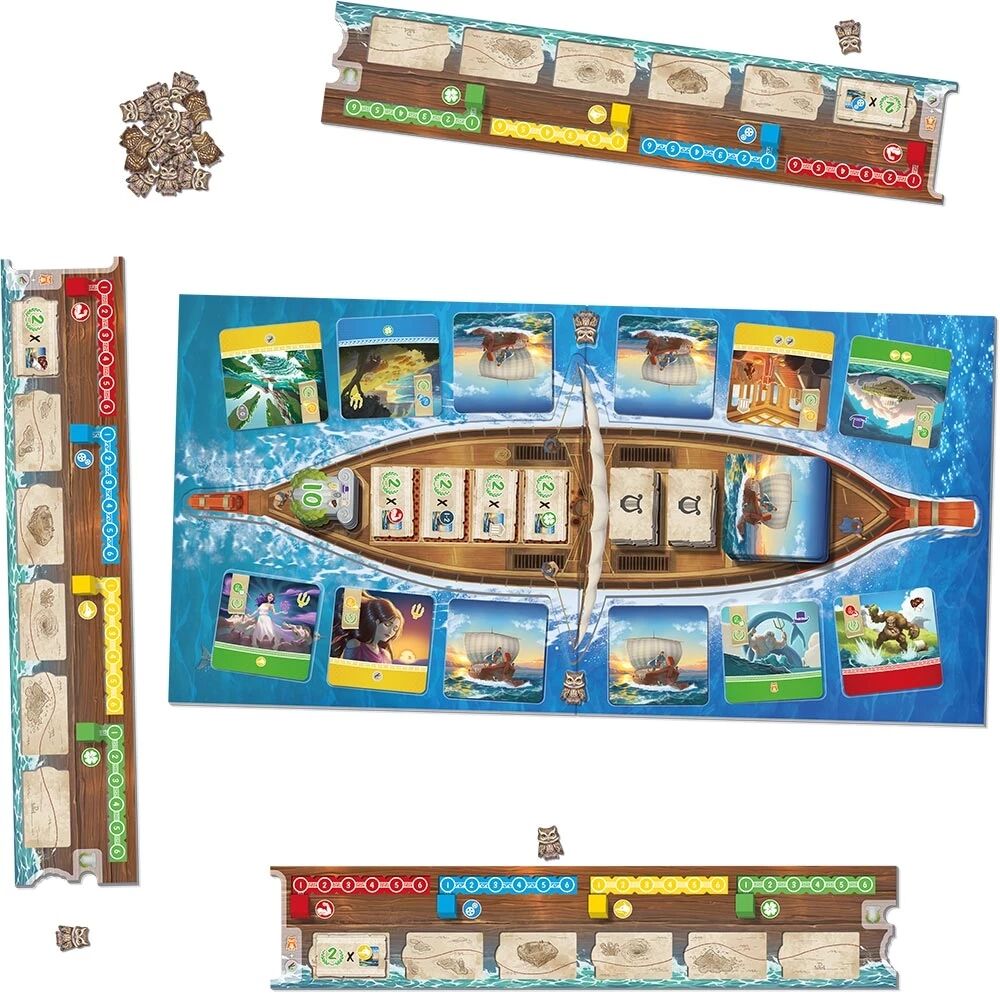Dans le jeu Odysseus, les joueurs prennent part à l’un des voyages les plus célèbres de la mythologie grecque : le long retour d’Ulysse après la guerre de Troie. À chaque tour, vous choisissez une carte Épreuve parmi celles disposées aux extrémités du navire d’Ulysse. Ces épreuves représentent les grandes étapes de l’Odyssée et font appel à quatre compétences clés : la force, l’intelligence, la ruse et la chance. Deux choix s’offrent alors à vous : partir à l’aventure pour développer vos compétences et enrichir votre récit, ou vous reposer afin d’optimiser votre progression et bénéficier de l’aide précieuse d’Athéna.