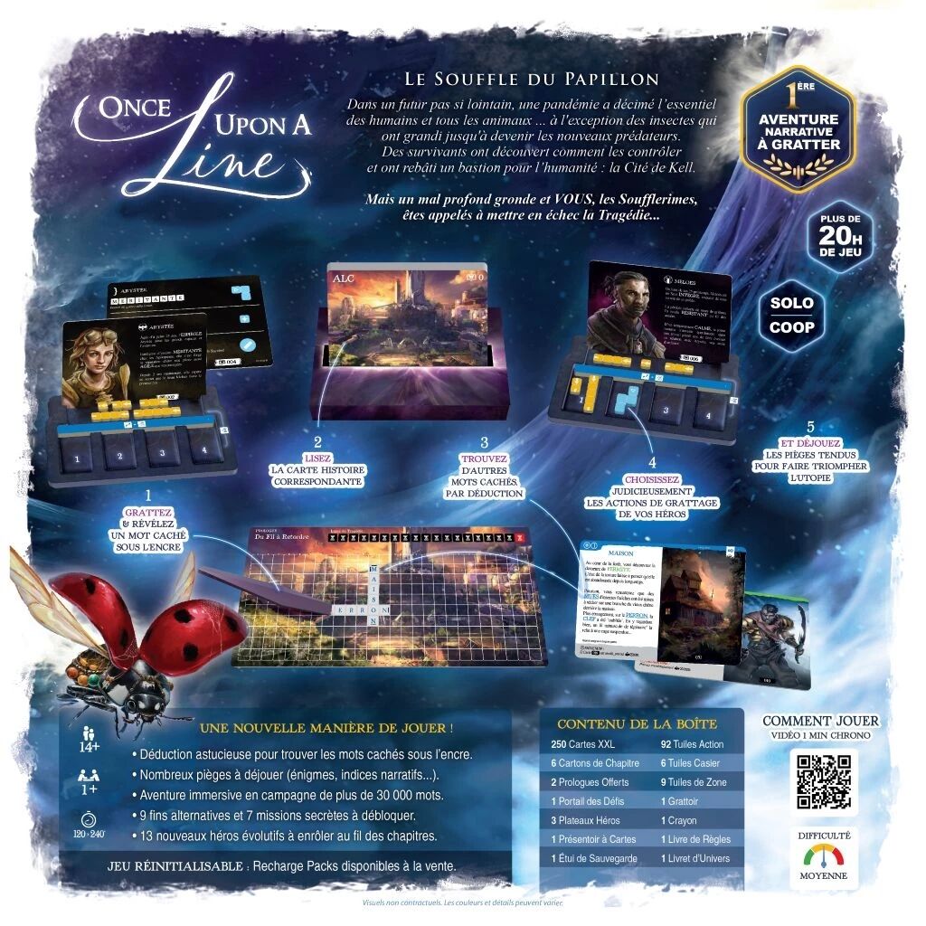 Dans Once Upon a Line : Le Souffle du Papillon, chaque décision est gravée physiquement dans la Grille du Destin, transformant vos choix en éléments tangibles de l’aventure. Vous devez révéler des mots en déduisant leur position, résoudre des énigmes, et faire progresser vos héros grâce à leurs talents uniques. Le système narratif ramifié permet de vivre une campagne complète, découpée en chapitres de plusieurs heures, avec la possibilité de sauvegarder votre progression.