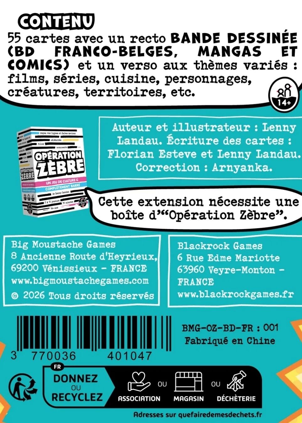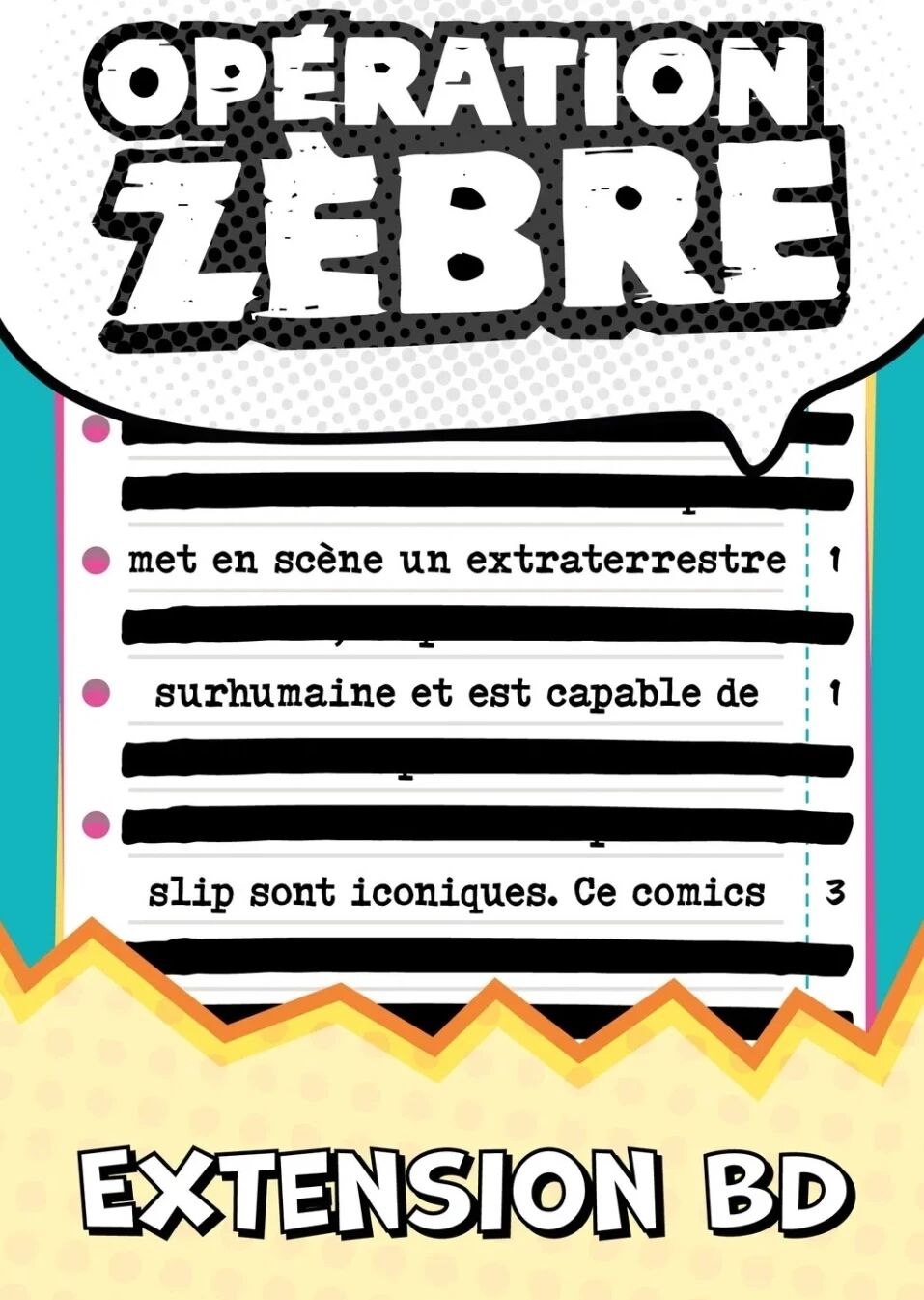 Simple à intégrer, l'extension BD s’adresse aussi bien aux amateurs de bande-dessinée qu’aux joueurs cherchant simplement à enrichir leurs parties d'Opération Zèbre avec de nouvelles thématiques.