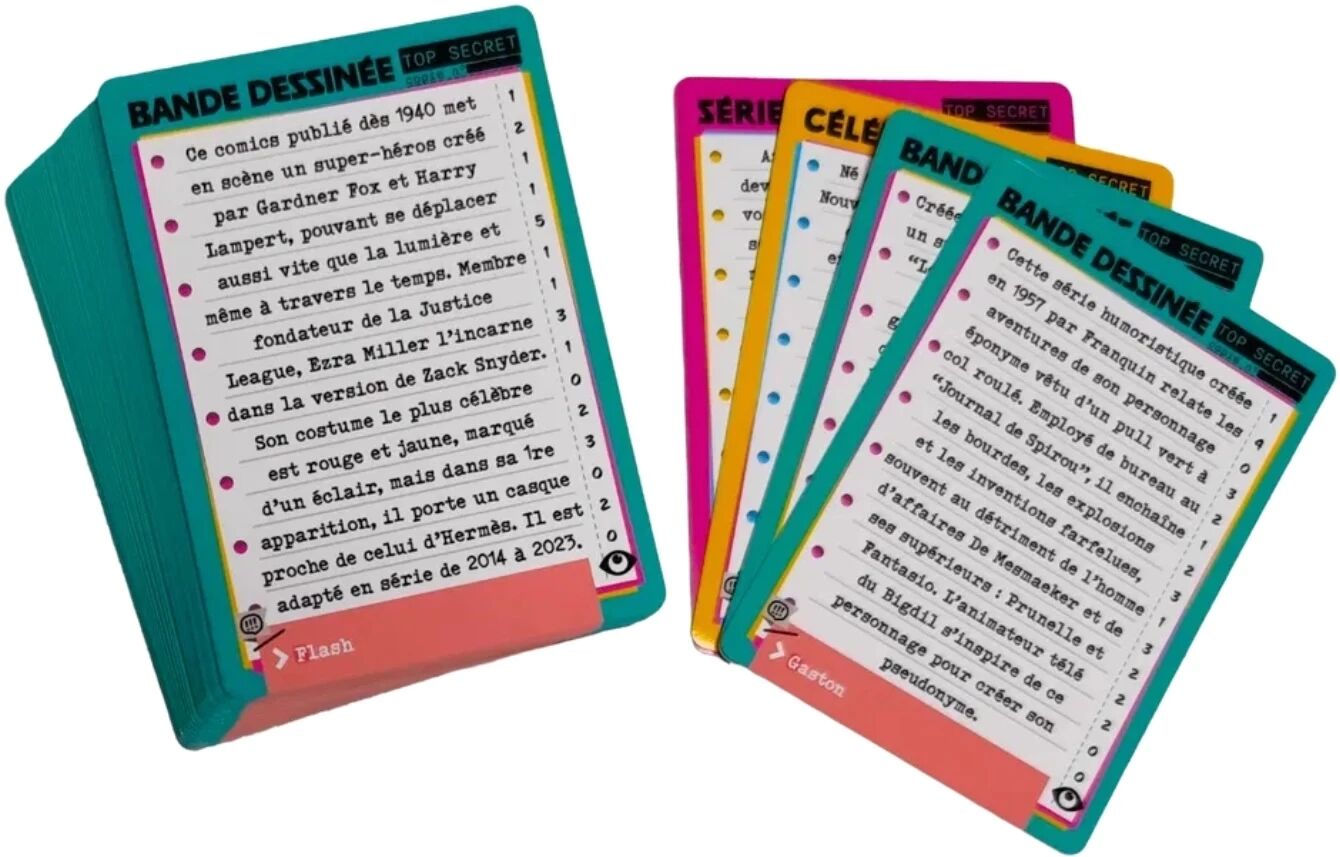 Sur le recto des cartes, la thématique principale met la bande-dessinée à l’honneur dans toute sa diversité : testez vos connaissances sur les héros iconiques, les univers graphiques, les styles narratifs ou encore les références culturelles au sens plus large. Au verso, l’extension propose un mélange de catégories issues du jeu de base et de nouvelles thématiques, telles que "Créature", "Collectif", ou même quelques cartes "Cuisine", toutes reliées à la BD.