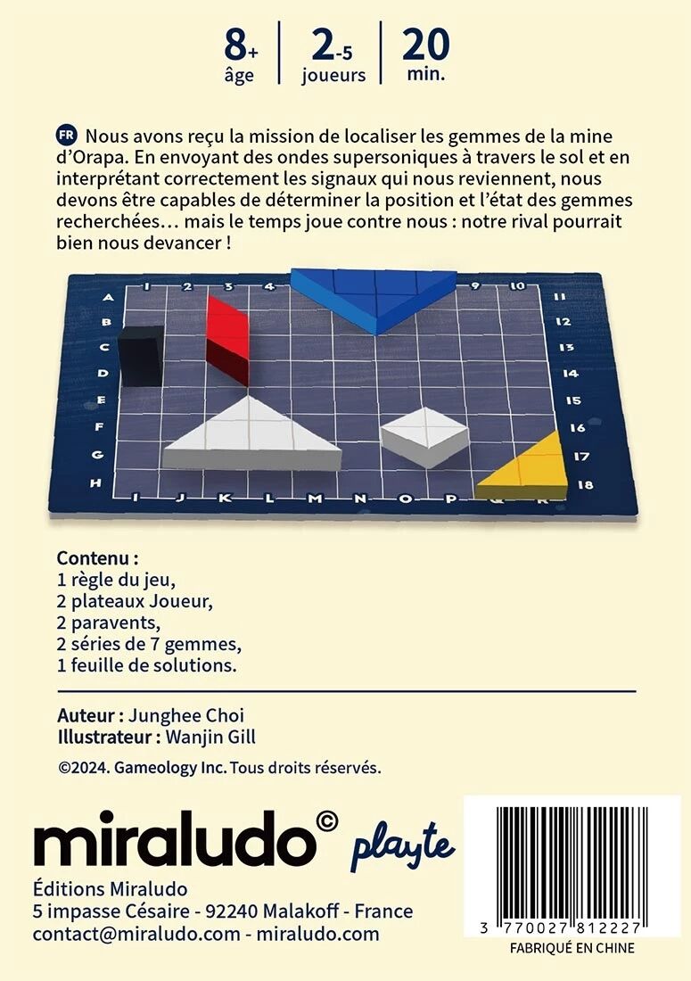 Orapa Mine est un jeu de déduction pure, exigeant rigueur, logique spatiale et sens de l’observation. Les parties sont rapides, avec une véritable montée en intensité à mesure que la configuration adverse se dévoile.