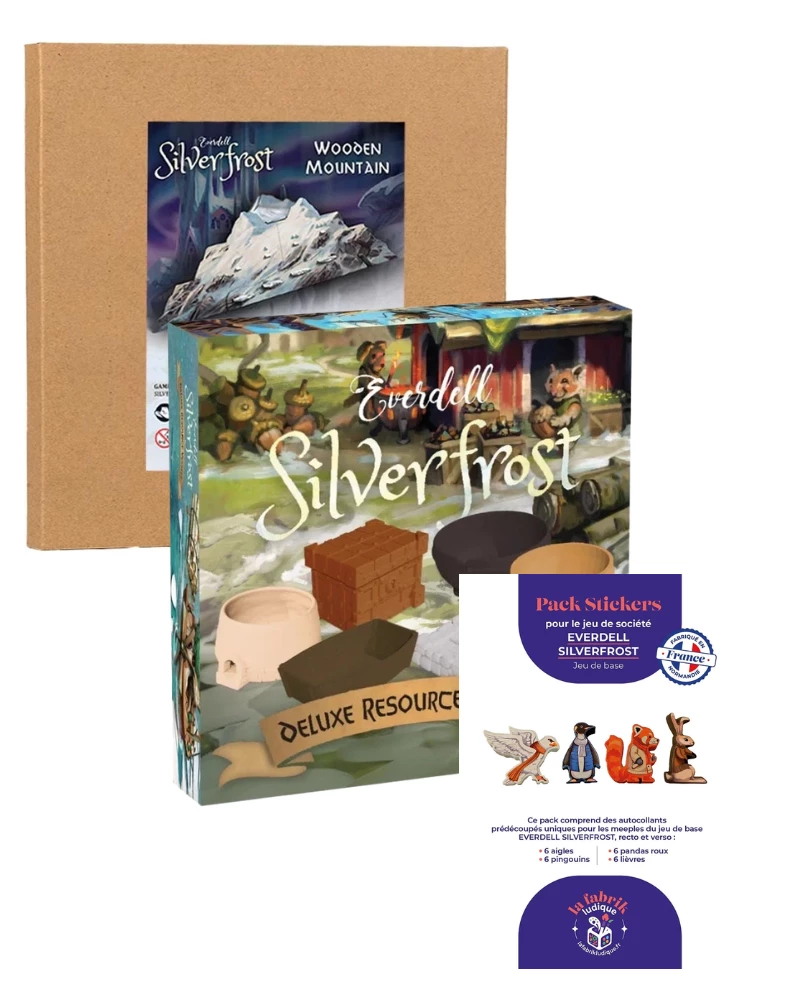 Le Pack Everdell Silverfrost comprend tous les accessoires pour le jeu de base. Notamment les Ressources Deluxe, les stickers pour vos meeples et une montagne en bois.
