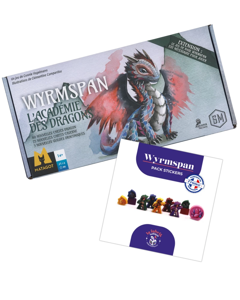 Le Pack Wyrmspan comprend l'extension Wyrmspan : L'Académie des Dragons et le Pack de Stickers pour le jeu de base Wyrmspan. Entraînez vos dragons, enrichissez vos stratégies et plongez encore plus profondément dans l’exploration de cavernes peuplées de créatures légendaires.
