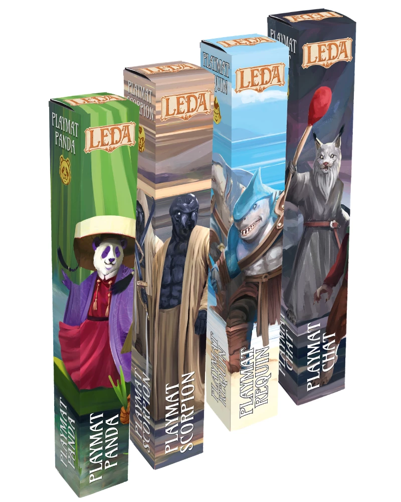 Le Pack Leda comprend les 4 tapis de jeu liés aux 4 factions jouable : Chats, Requins, Scorpions et Pandas.