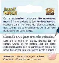 Cette extension propose 120 nouveaux mots à inclure dans le jeu Perfect Words. Plongez dans l’univers du divertissement, des sports, de la musique et de la culture populaire au sens large.