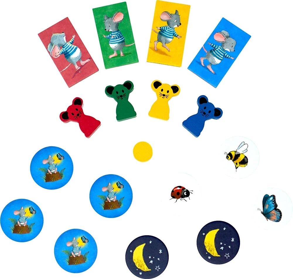 1 plateau de jeu, 50 jetons Exploration, 1 jeton Soleil, 4 pions Souris, 4 jetons Joueur, 1 livret de règles